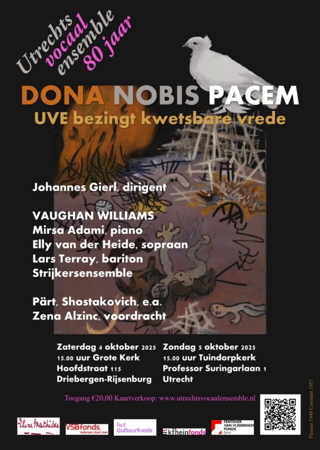 In 2025 bestaat het Utrechts Vocaal Ensemble (UVE) tachtig jaar. Dit viert het gezelschap met twee concerten onder het motto Dona nobis pacem op zaterdagmiddag 4 oktober in Driebergen (Grote Kerk) en zondagmiddag 5 oktober in Utrecht (Tuindorpkerk). Onder leiding van Johannes Gierl bezingt het UVE, opgericht in het vredesjaar 1945, de zo kwetsbare vrede. Er klinkt ook een oproep tot strijd. Want kan wel sprake van vrede zijn als er groot onrecht is? Onrecht dat bestreden moet worden?